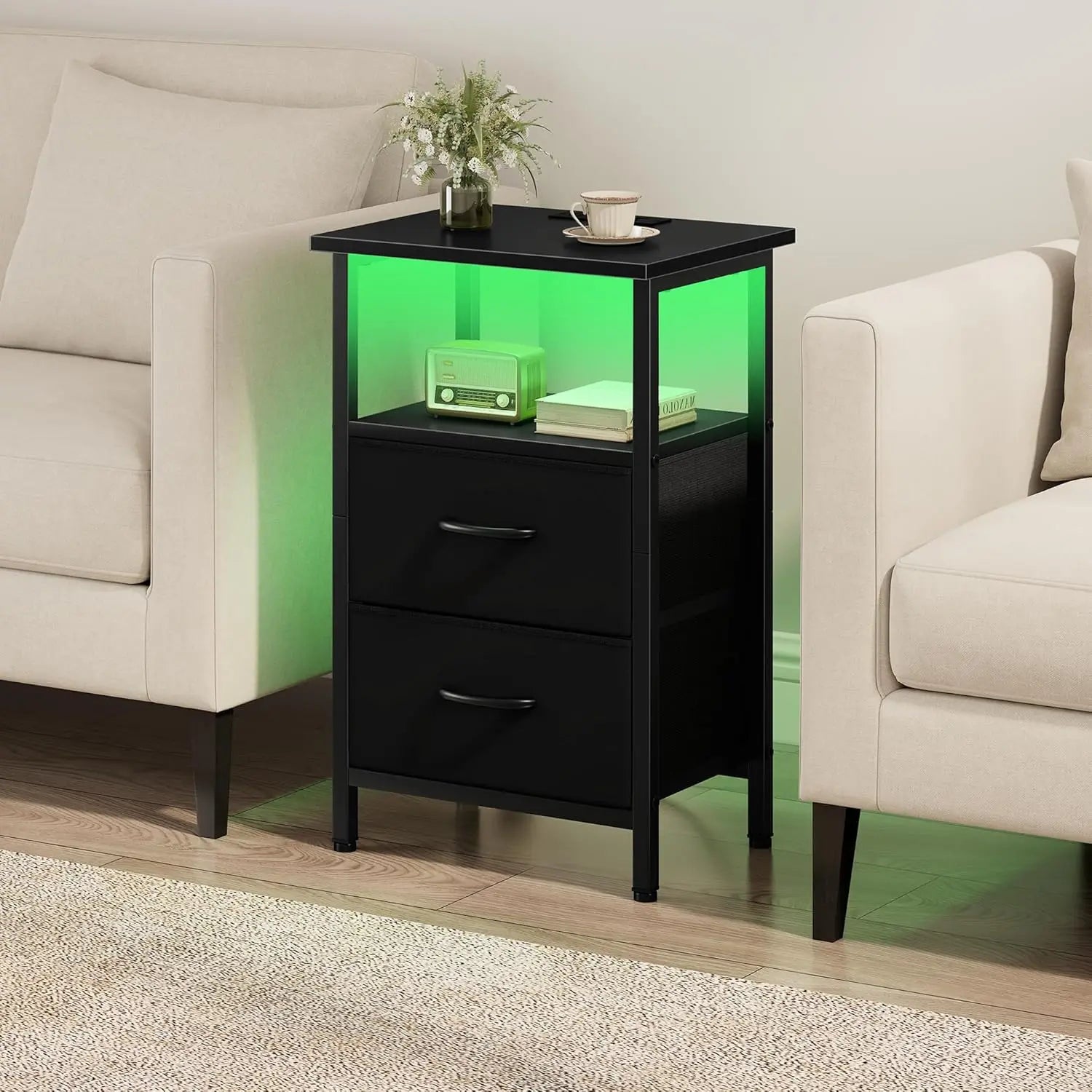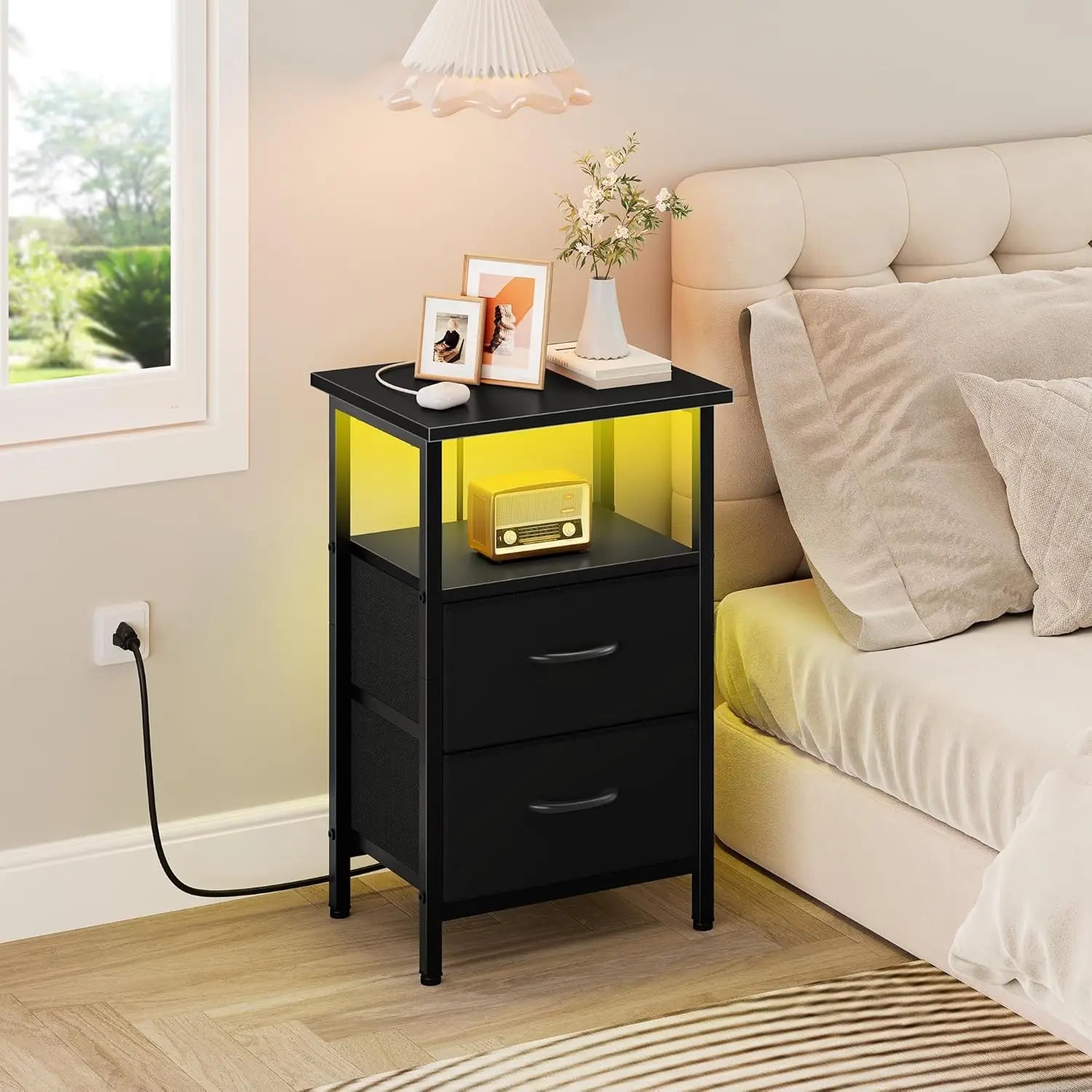 Transform your bedroom or living space with these stylish nightstands featuring customizable RGB LED strips. Adjust colors, brightness levels, and flash modes to create the perfect atmosphere—whether you want a cozy warm glow for relaxation or vibrant hues for entertaining. The lighting adds both functionality and decorative appeal to any room. 【Convenient Charging Station】Stay powered up effortlessly with integrated charging solutions. Each nightstand includes 2 USB ports and 2 AC outlets, designed with built-in plugs to minimize clutter. Charge multiple devices simultaneously—phones, tablets, lamps, e-readers—all from one convenient location by your bed or sofa. 【Smart Storage Solutions】Maximize organization with practical storage features. Two breathable non-woven fabric drawers offer dust-resistant compartments for essentials like books, remotes, or personal items. Additional open wooden shelves provide easy access to frequently used items such as coffee mugs, snacks, magazines, or alarm clocks. 【Durable & Safe Construction】Built to last with a sturdy frame and high-quality particleboard materials. The enlarged tabletops feature protective corner guards to prevent damage in busy households. Four adjustable feet ensure stability on uneven floors—no wobbling or tipping concerns even in homes with active children or pets. 【Versatile Design for Multiple Spaces】With dimensions of 14.9"D x 13.4"W x 24.2"H (each unit), these nightstands blend modern and vintage aesthetics seamlessly. Use them as bedside tables in bedrooms, accent tables in living rooms, storage units in home offices, or toy organizers in children's rooms—their compact design makes them ideal for apartments and smaller spaces. 【Easy Assembly & Reliable Support】Setup is straightforward with clearly numbered parts and included tools following detailed instructions. Backed by comprehensive customer support including replacement parts if needed during assembly.
