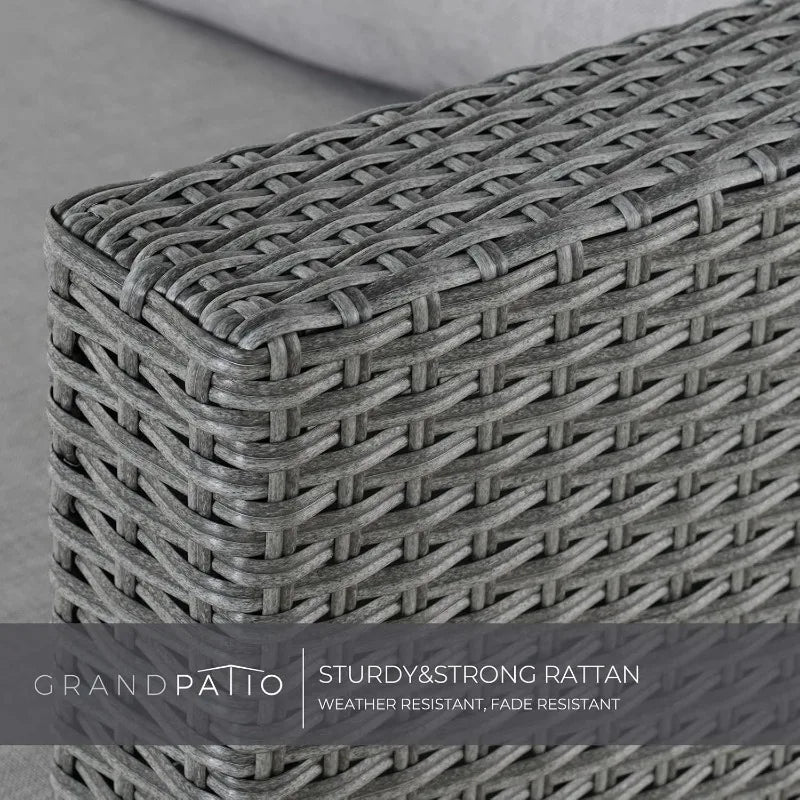 MODULAR DESIGN:This patio furniture set with fire pit table includes 1 left arm facing loveseat, 1 right arm facing loveseat, 2 armless chairs, and one rectangular fire pit table, the full set offers several options, you can combine the sofa set in different ways accoding to real occasions.